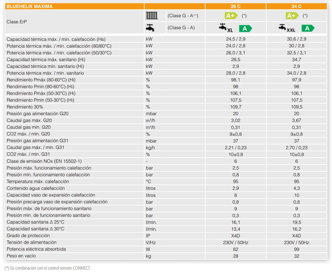 Clase A+: alcanza la máxima eficiencia energética A+ (en una escala de G a A+++) cuando se combina con el control remoto modulante CONNECT y la lectura de la temperatura exterior obtenida directamente de internet.